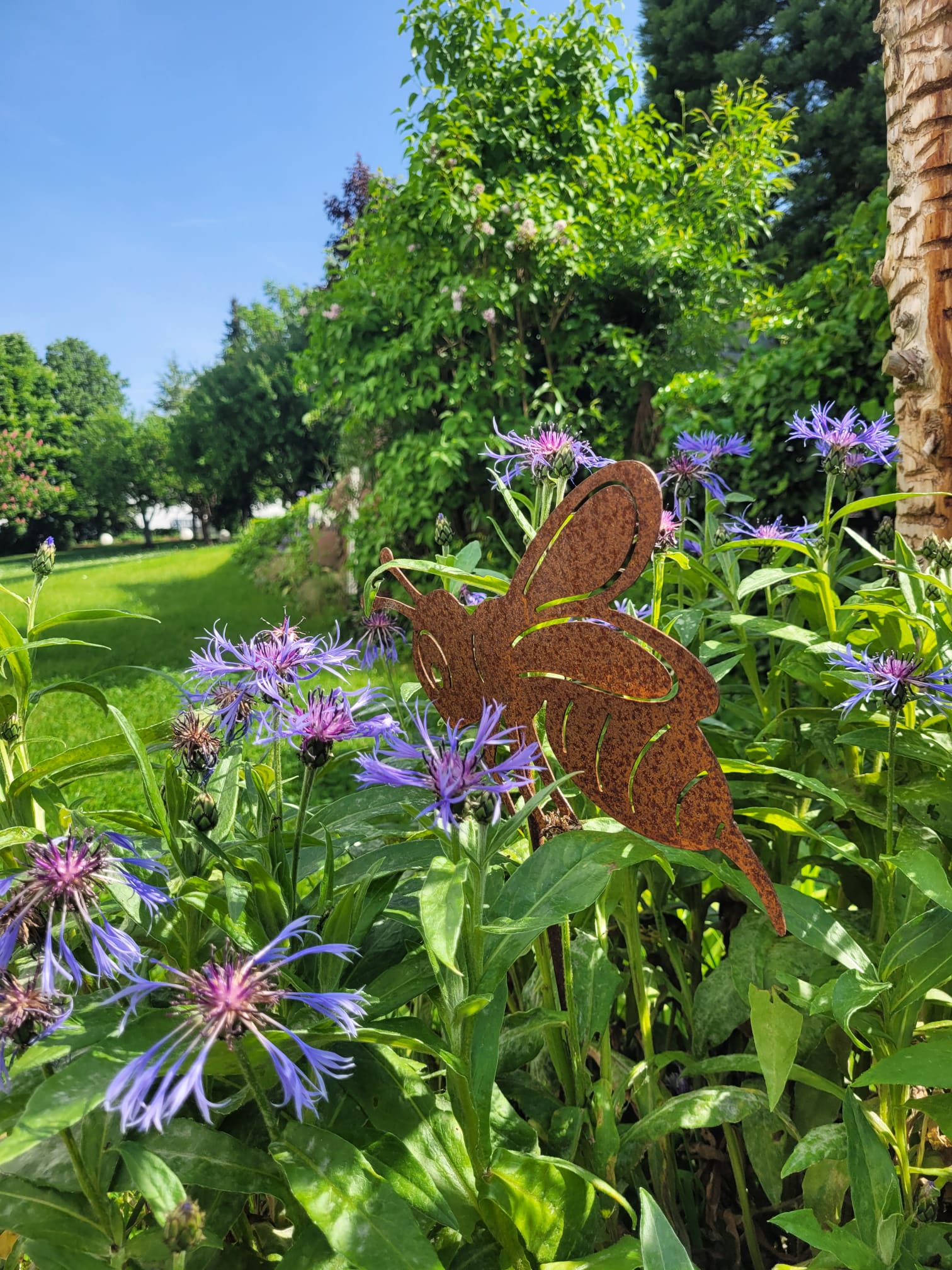 Urban und kreativ. Im Einklang mit der Natur. Kein klassischer Hotelgarten, sondern fast 4000 qm Natur und Leben, Benjeshecke, Kunstwerke, Bach und Teich.